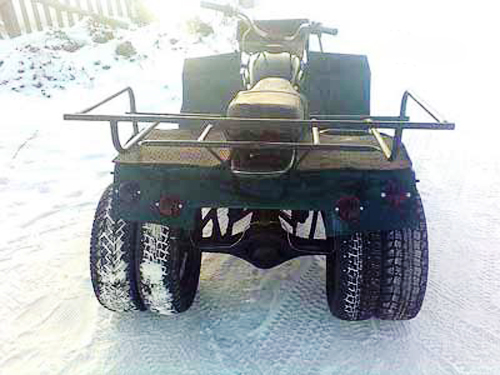 Необычная компоновка задних колес парами придает брутальный вид квадроциклу. Мощности двигателя хватает для транспортировки прицепа с грузом до полутоны, а пустой квадрацикл на асфальте со старта способен на пробуксовку колес