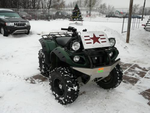 Защита днища и подвески. Радиатор был перенесен наверх и тоже обзавелся защитой выполненной в сугубо патриотическом стиле. Передняя электрическая лебедка была установлена в комплекте с радиопультом крепящимся на руле. Так же квадрик обзавелся подогревом руля, весьма полезная опция для зимней эксплуатации. Воздухозабор двигателя и вентиляция картера так ж были выведены наверх для того чтобы "гризлик" мог форсировать глубокие броды. В связи с установкой агрессивной широкий резины на арках смонтировали пластиковые расширители